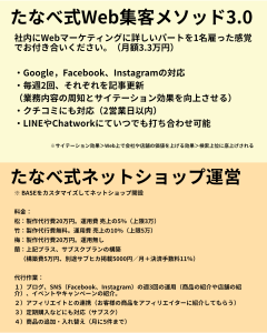 ~ たなべ式Web集客メソッド3.0 ~社内にWebマーケティングに詳しいパートを1名雇った感覚でお付き合いください。(月額3.3万円)Google,Facebook、Instagramの対応毎週2回、それぞれを記事更新(業務内容の周知とサイテーション効果を向上させる)クチコミにも